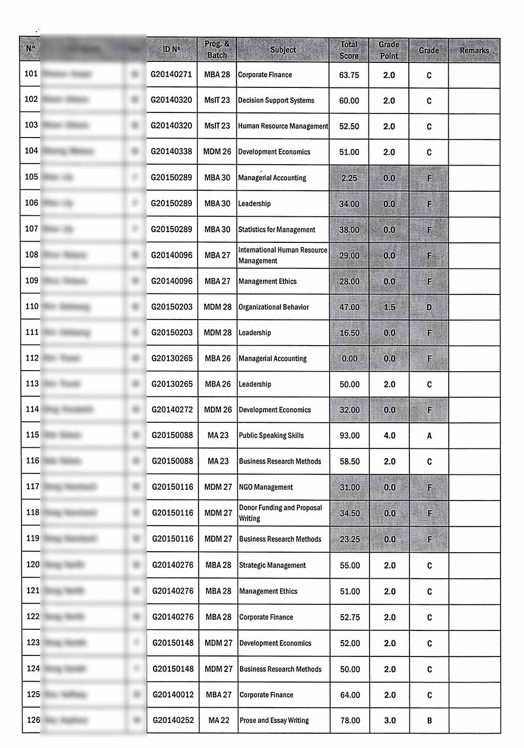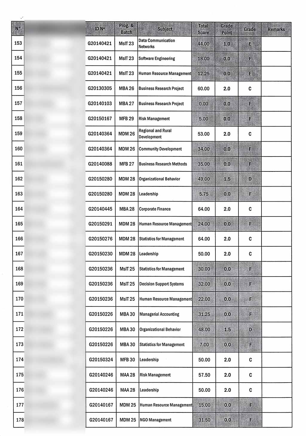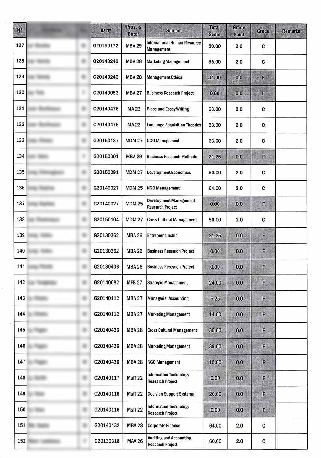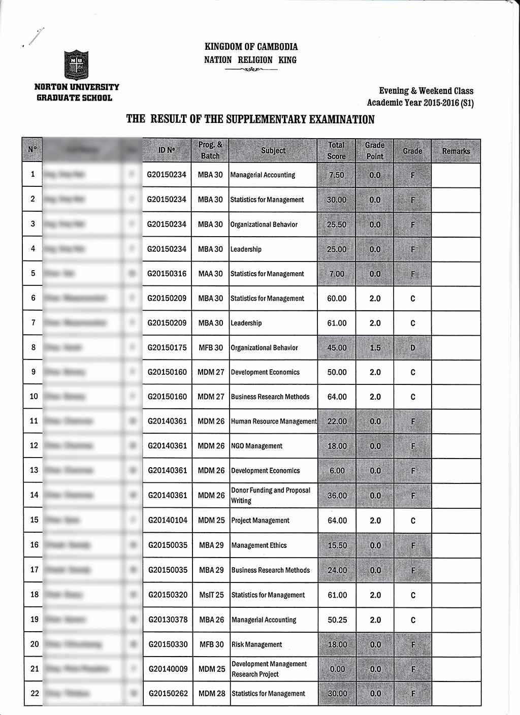 The result of the supplementary examination, Evening and Weekend Class Academic Year 2015-2016 (Semester 1)