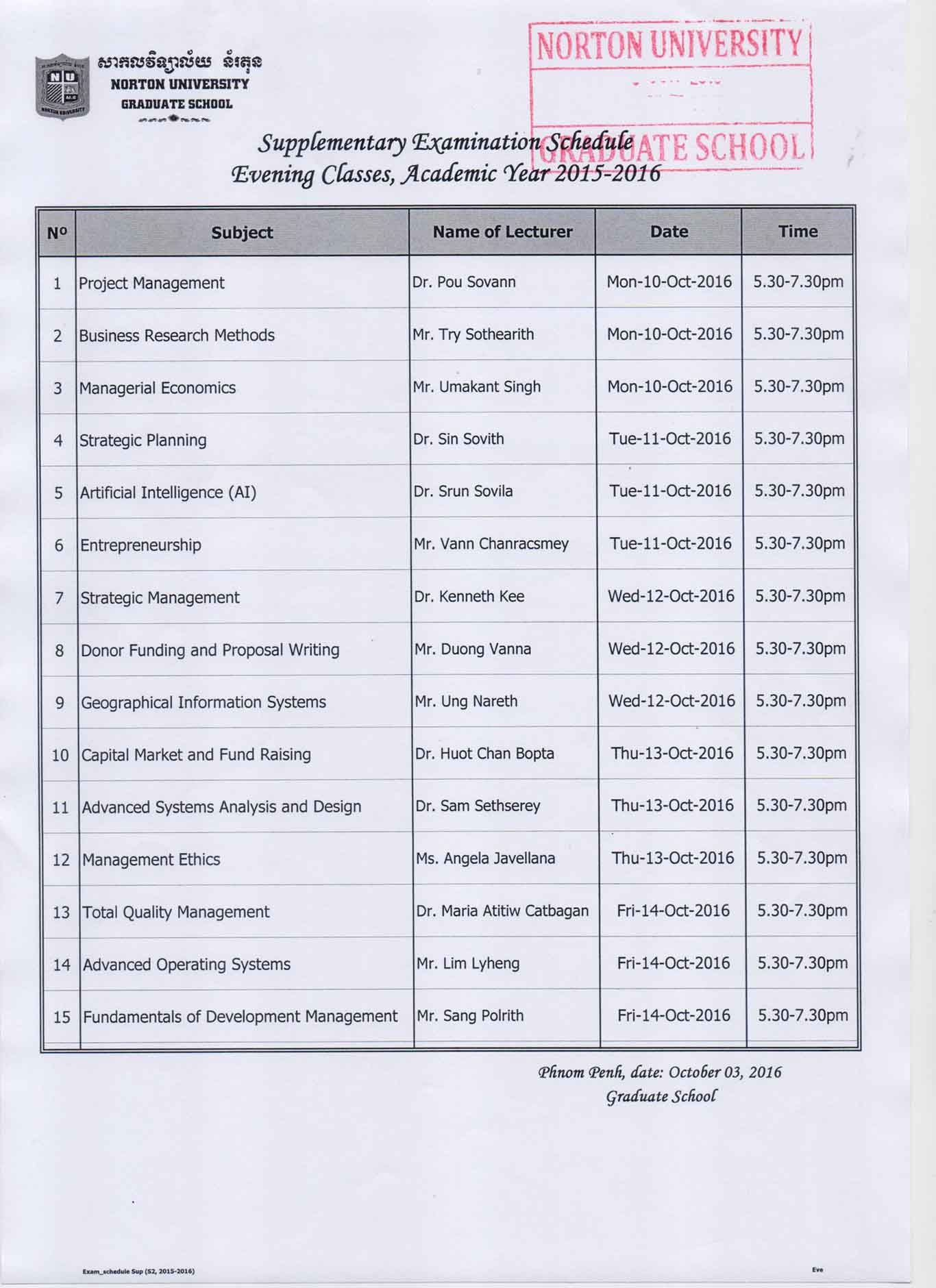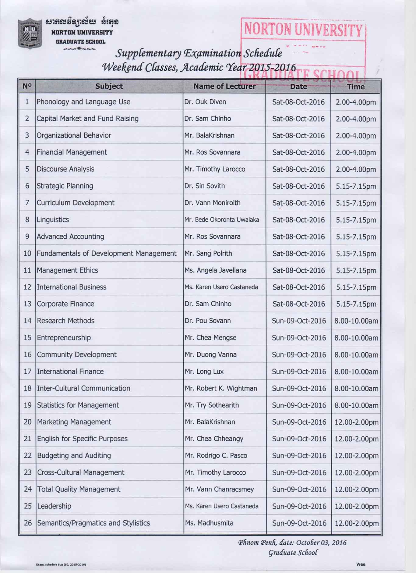 Supplementary examination schedule Weekend and Evening Classes (Master), Academic Year 2015-2016