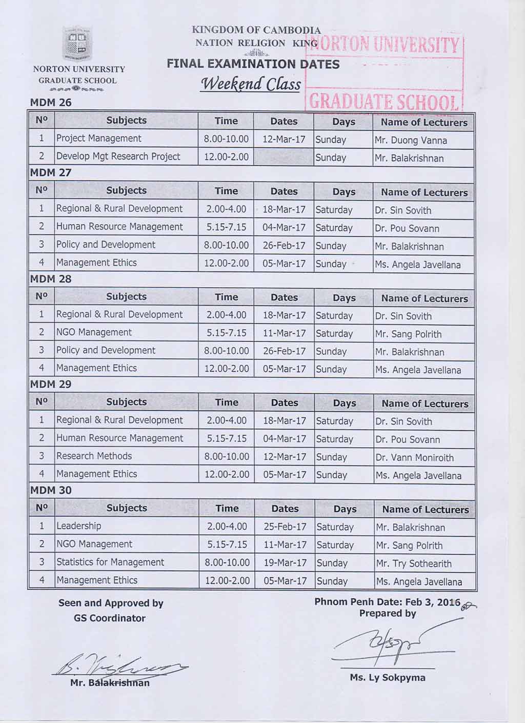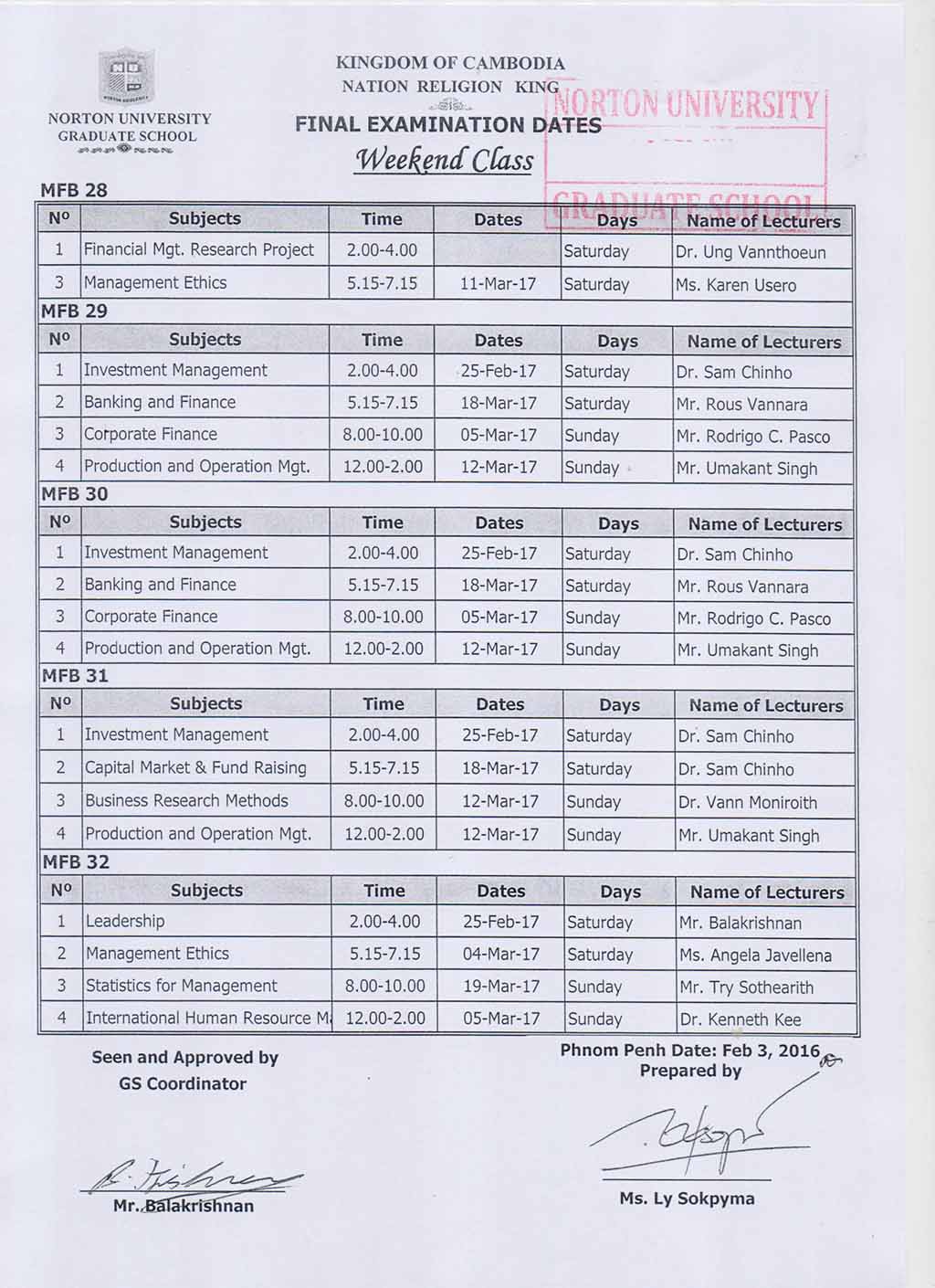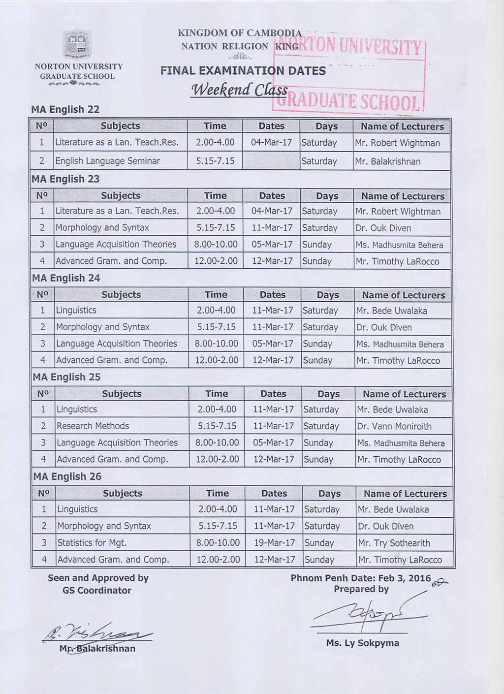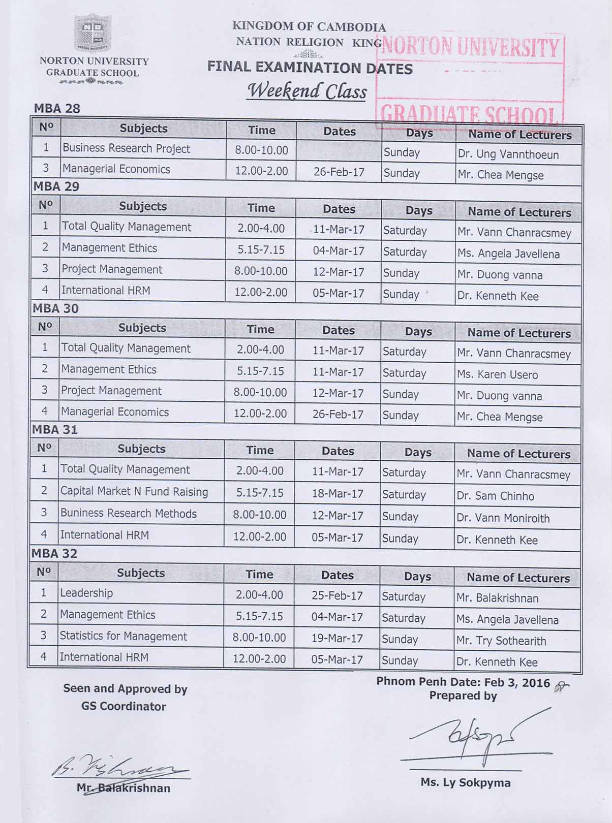 Final Examination Dates Evening and Weekend Classes (GRADUATE SCHOOL NORTON UNIVERSITY)