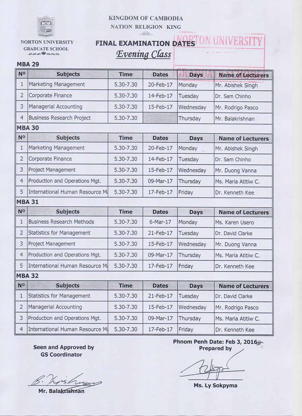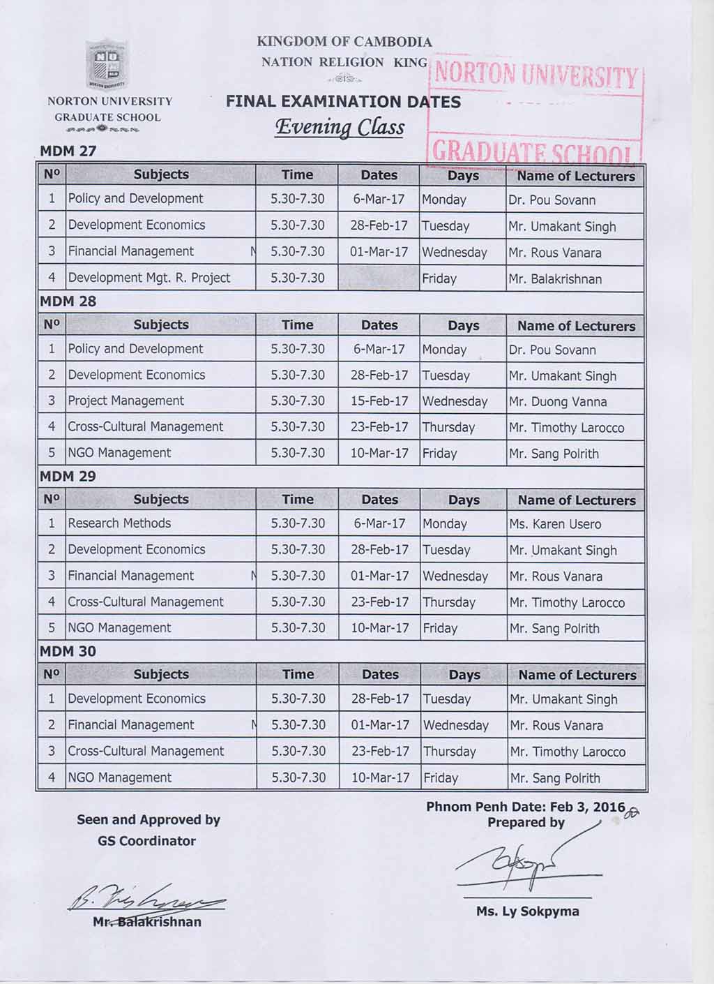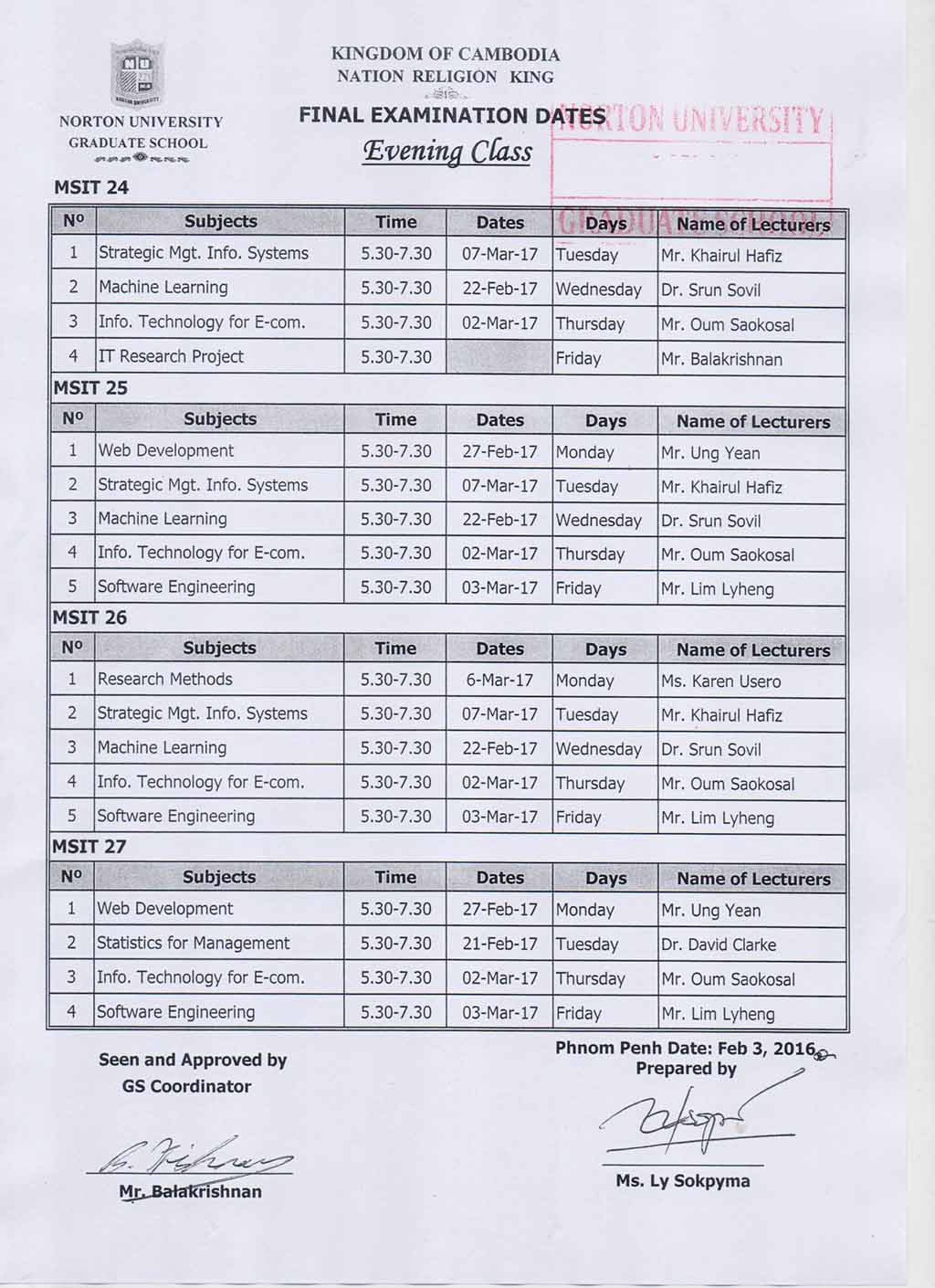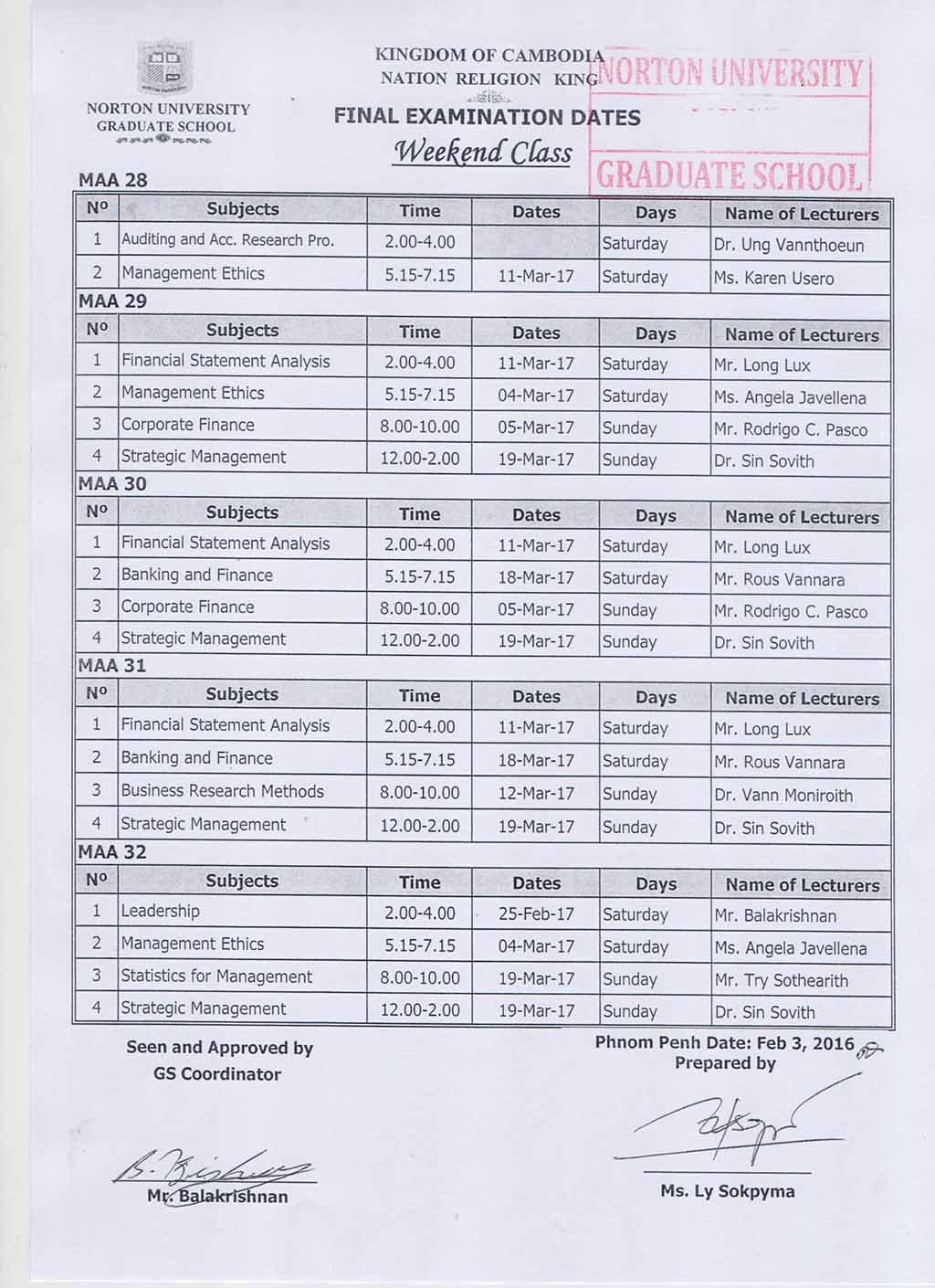 Final Examination Dates Evening and Weekend Classes (GRADUATE SCHOOL NORTON UNIVERSITY)