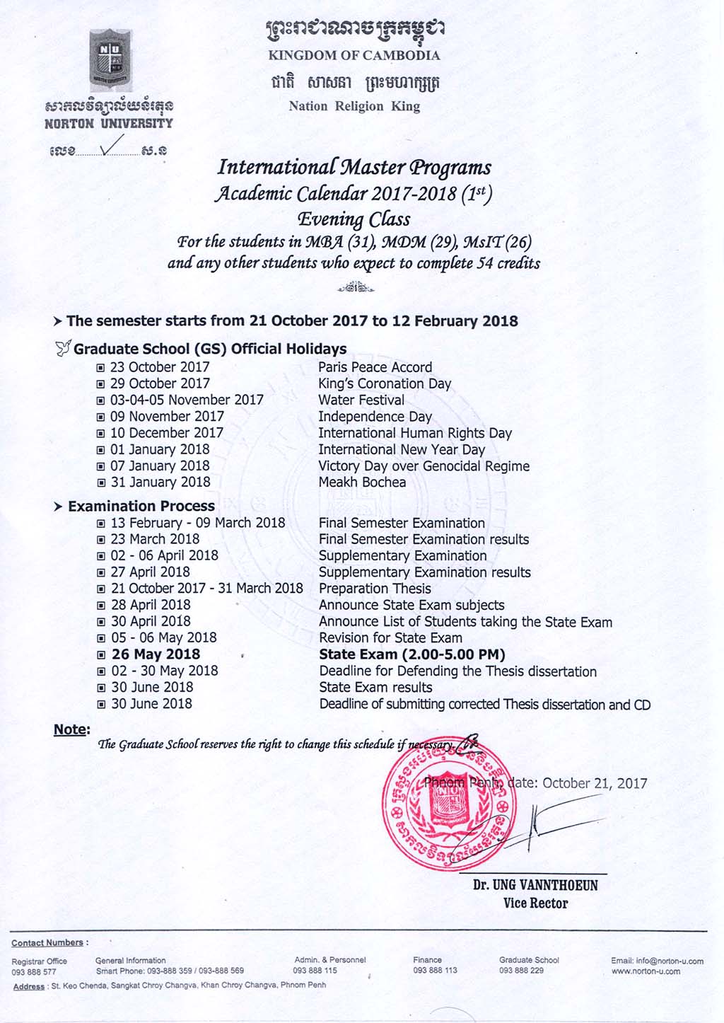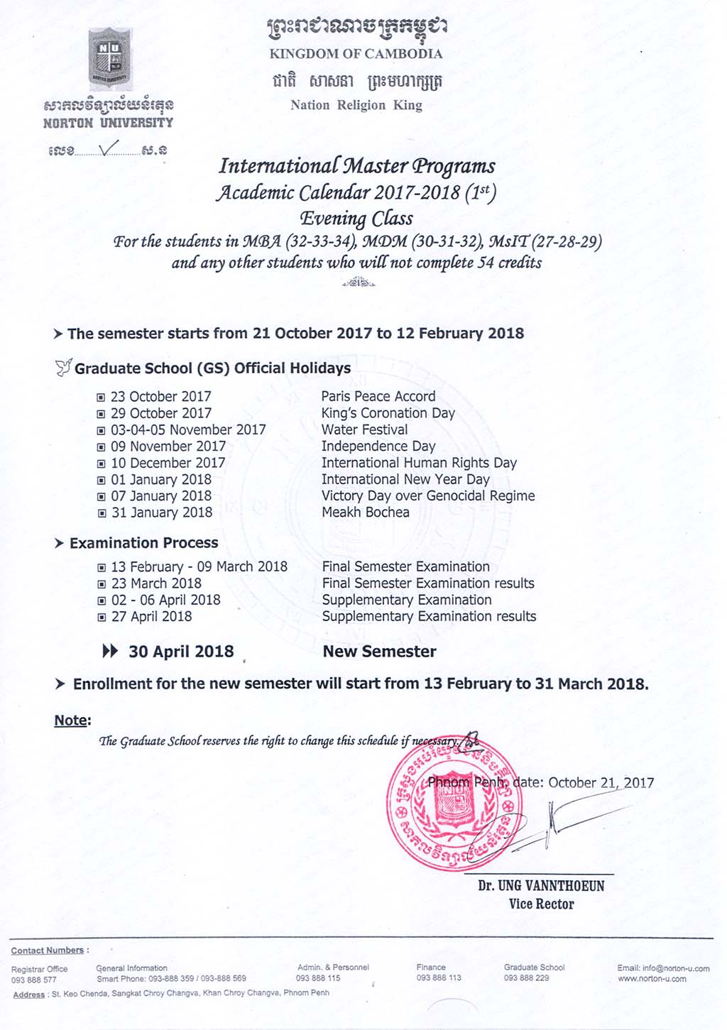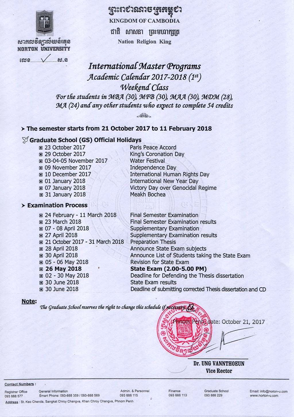 Academic Calendar 2017-2018 (1st) Evening and Weekend Classes