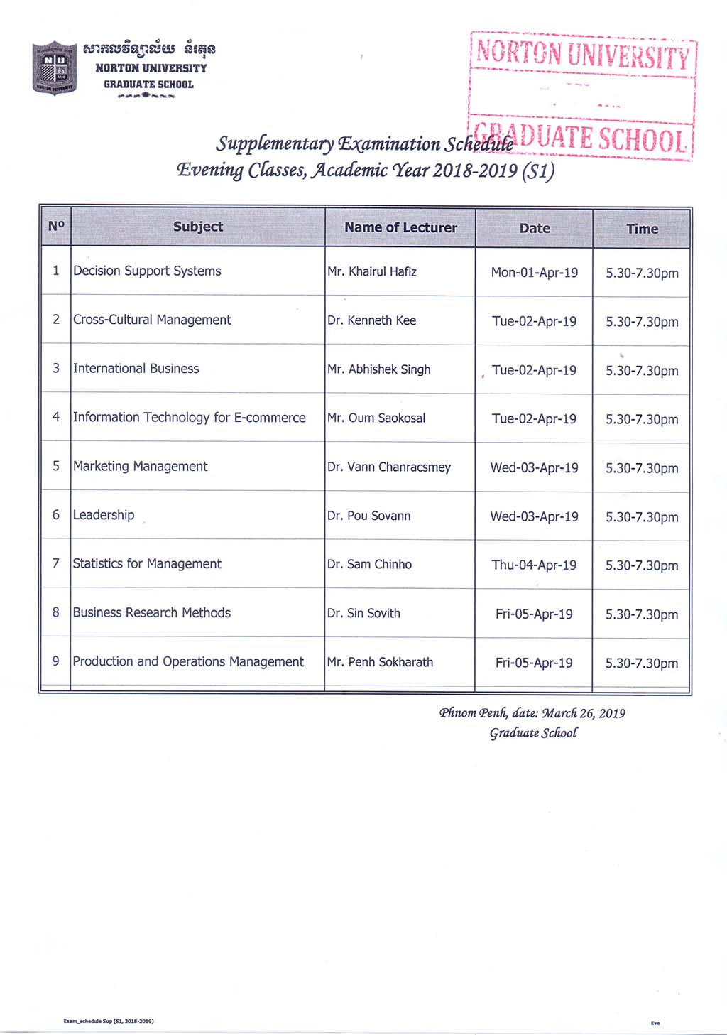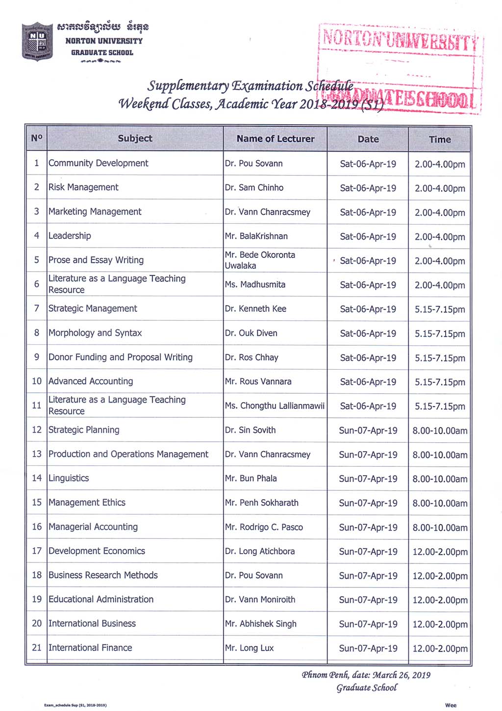 Supplementary Examination Schedule Weekend and Evening Classes, Academic Year 2018 - 2019 Semester 1