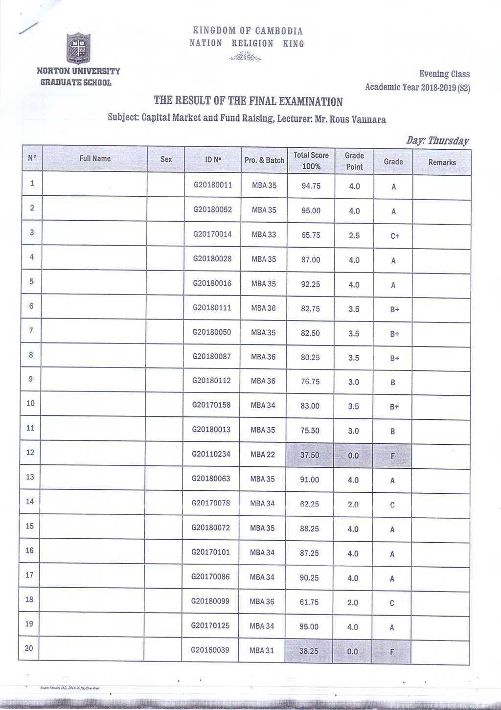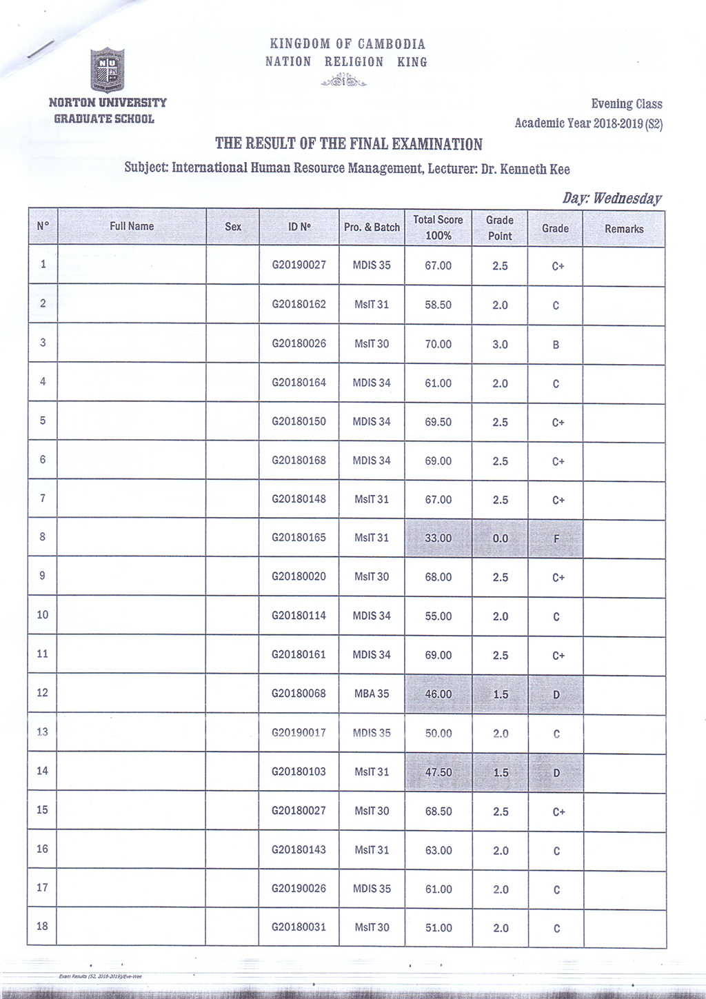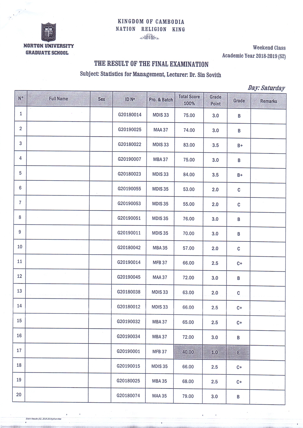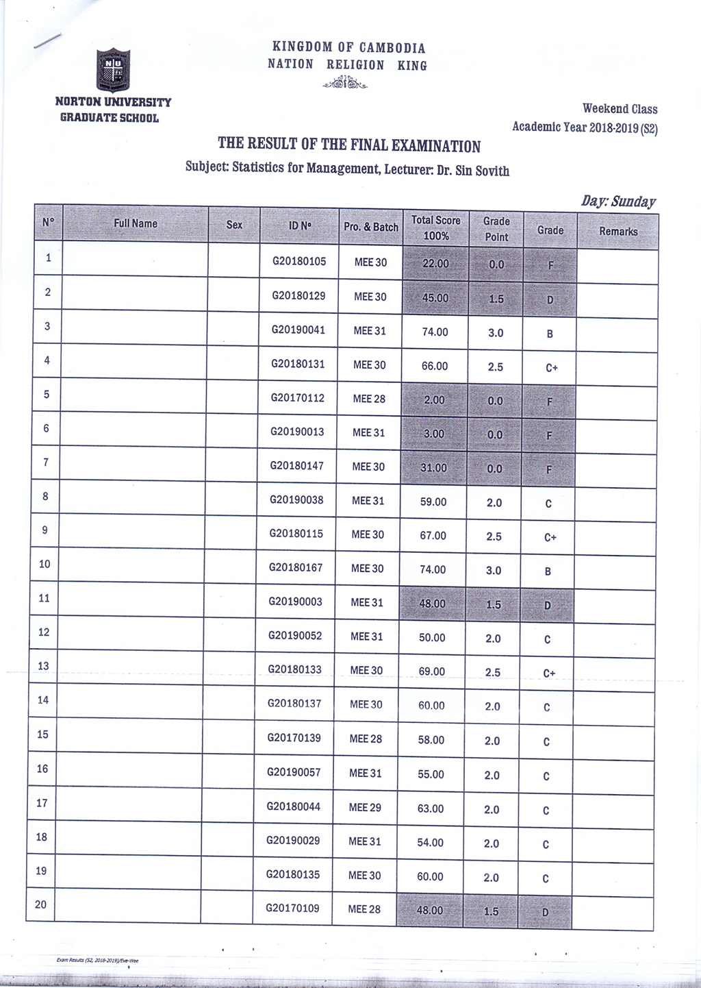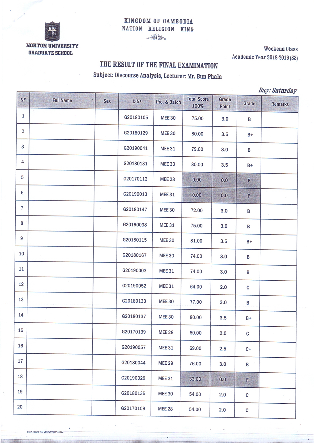 The Result of the Final Examination Semester 2 Academic Year 2018 - 2019 Evening and Weekend Classes