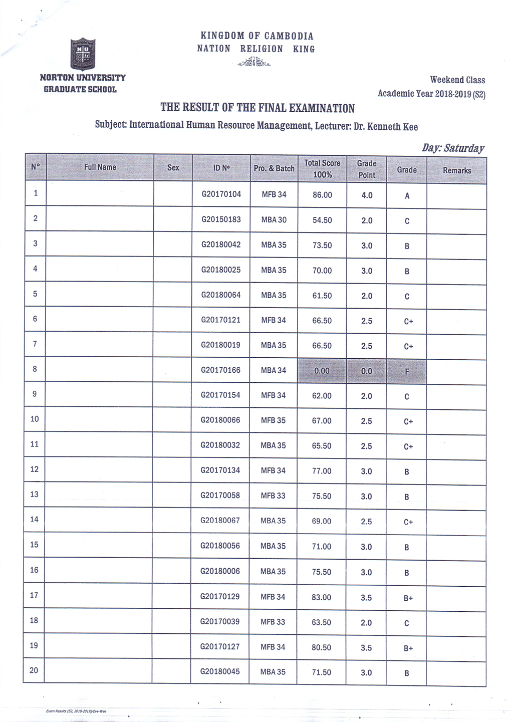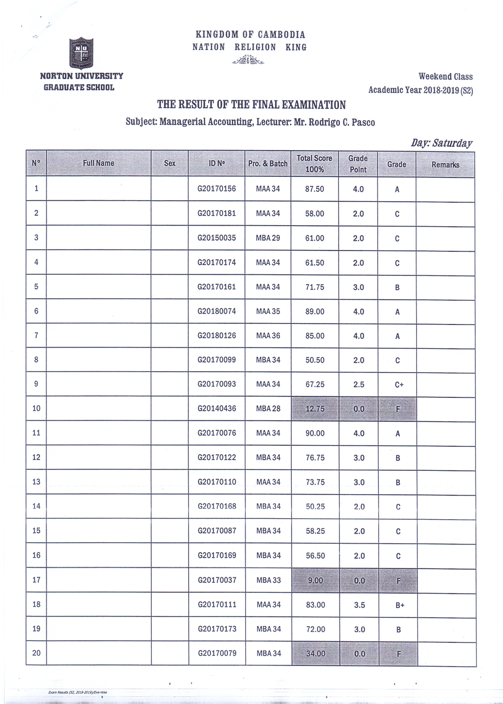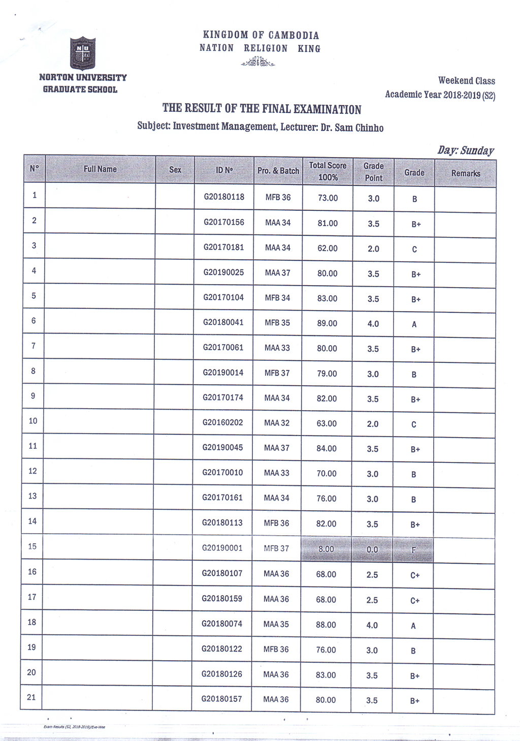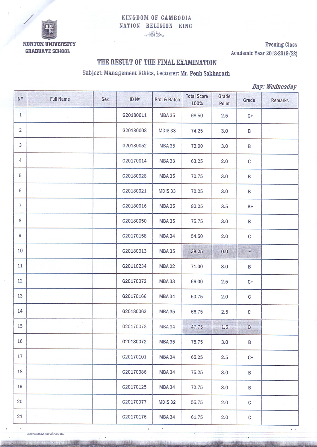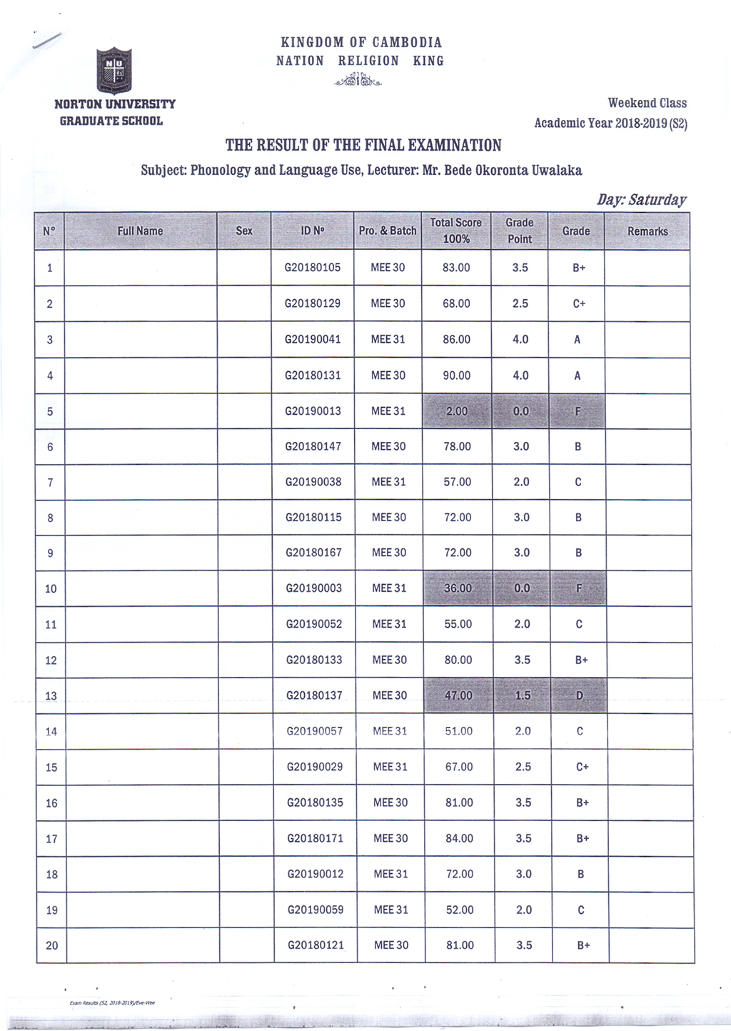 The Result of the Final Examination Semester 2 Academic Year 2018 - 2019 Evening and Weekend Classes