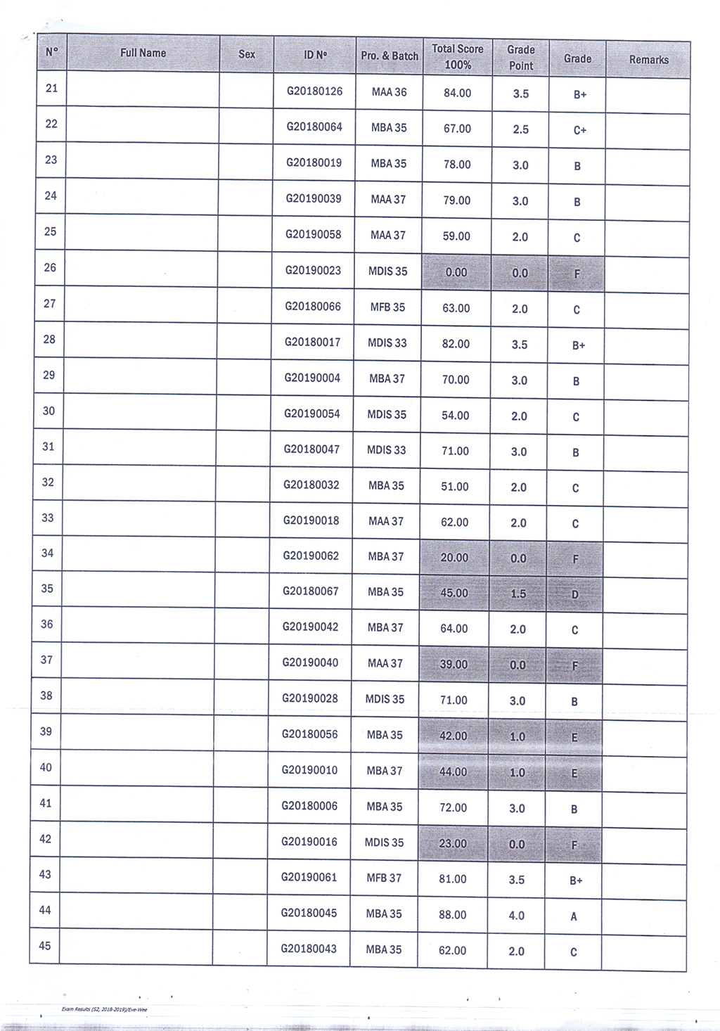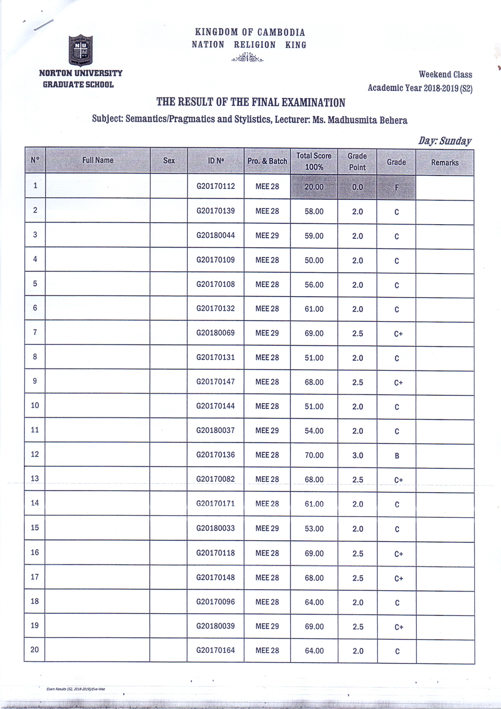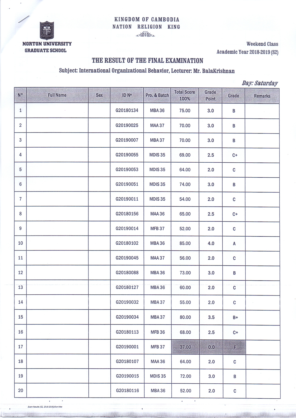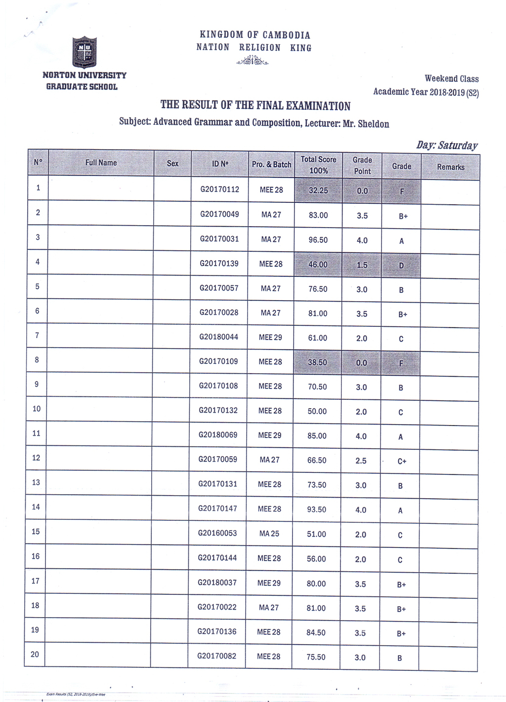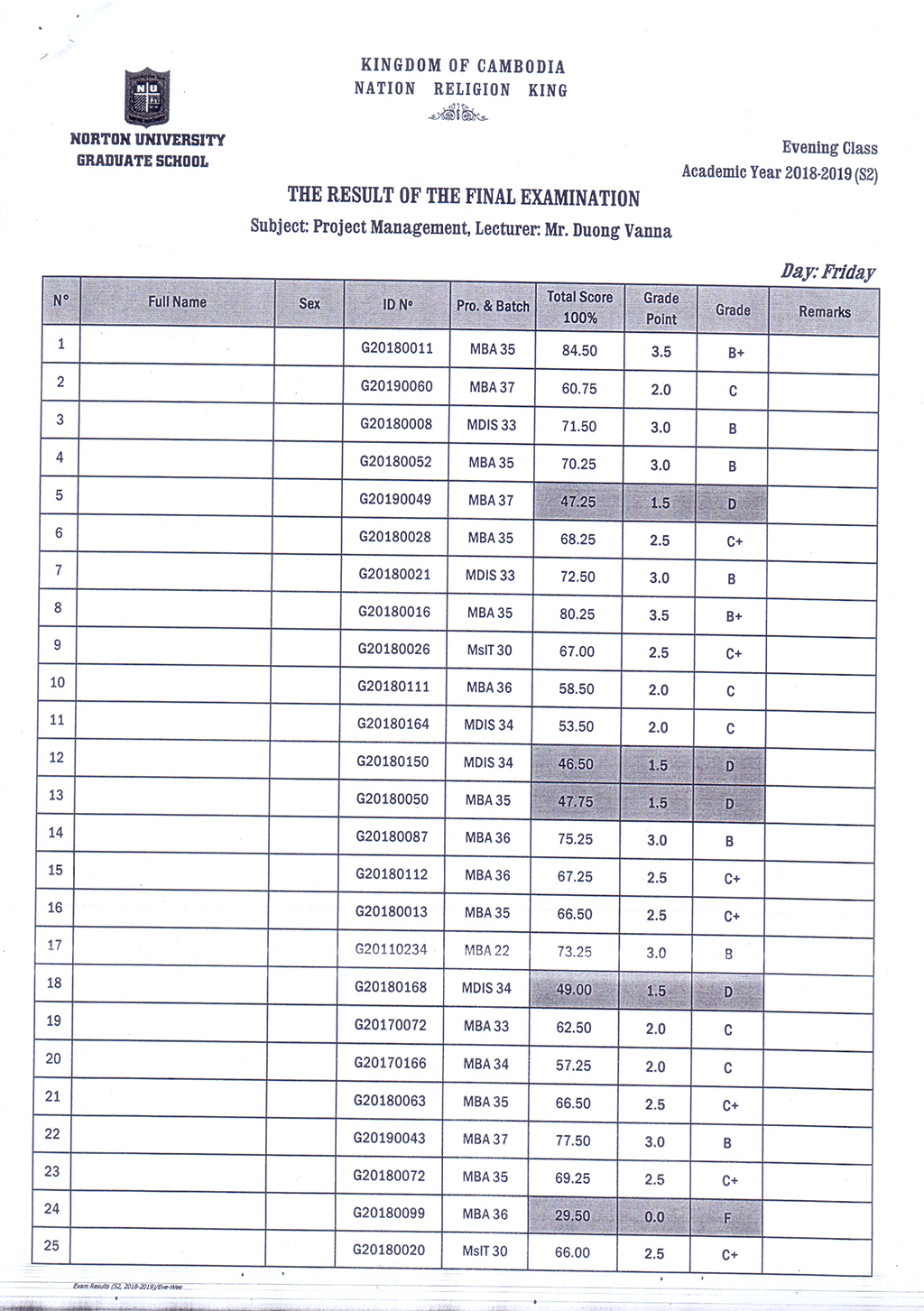 The Result of the Final Examination Semester 2 Academic Year 2018 - 2019 Evening and Weekend Classes