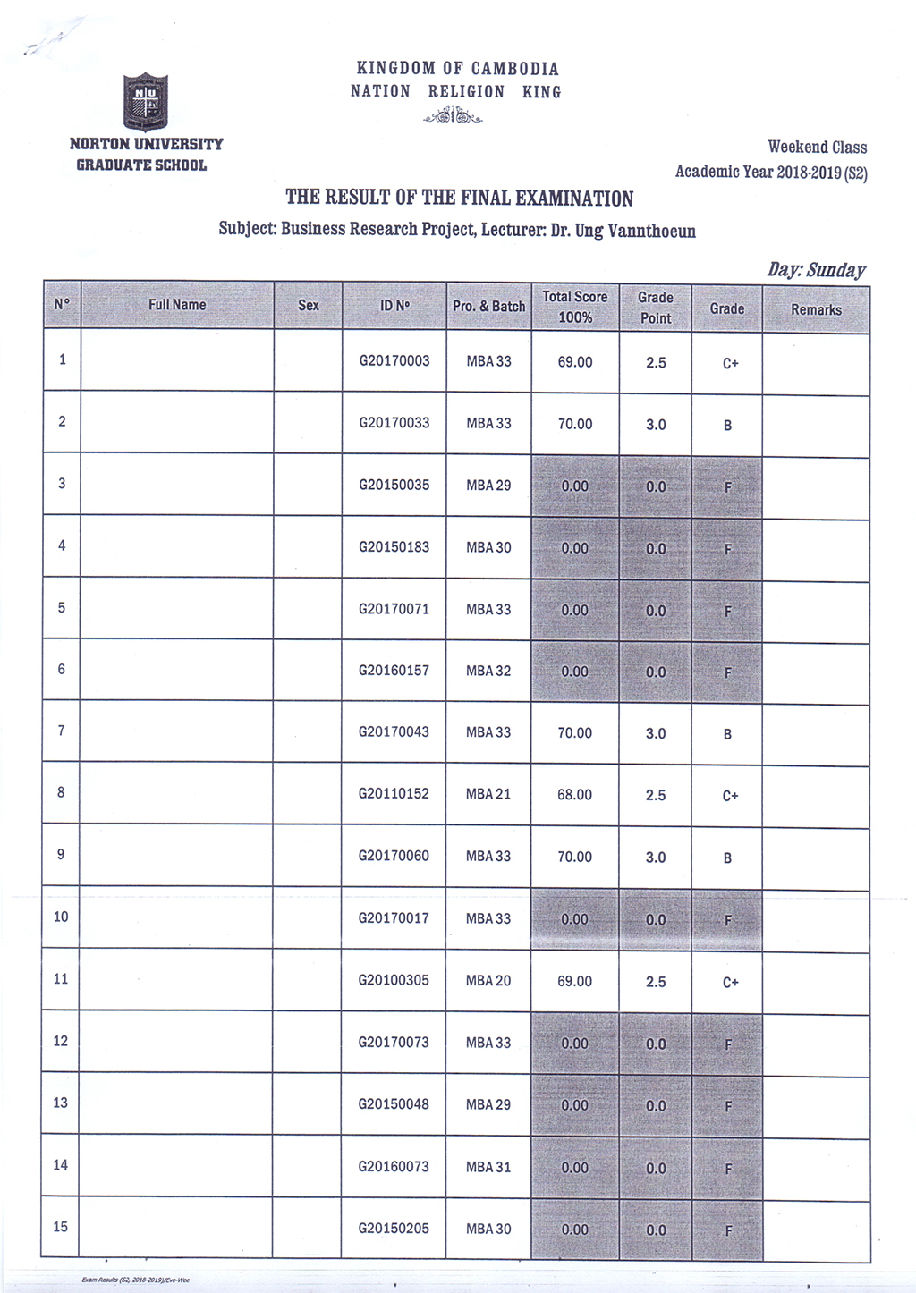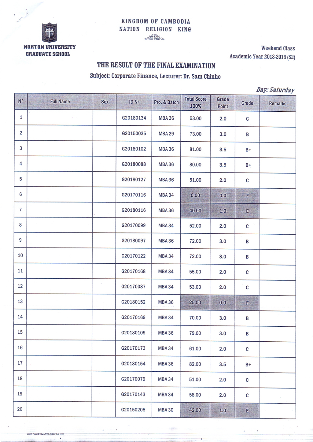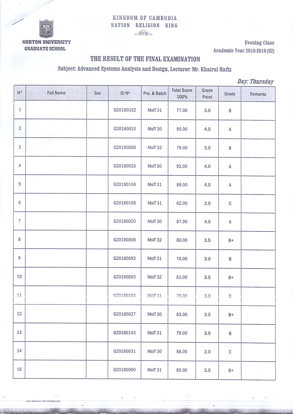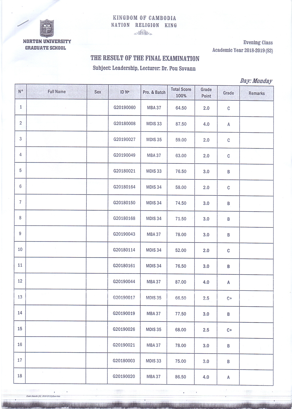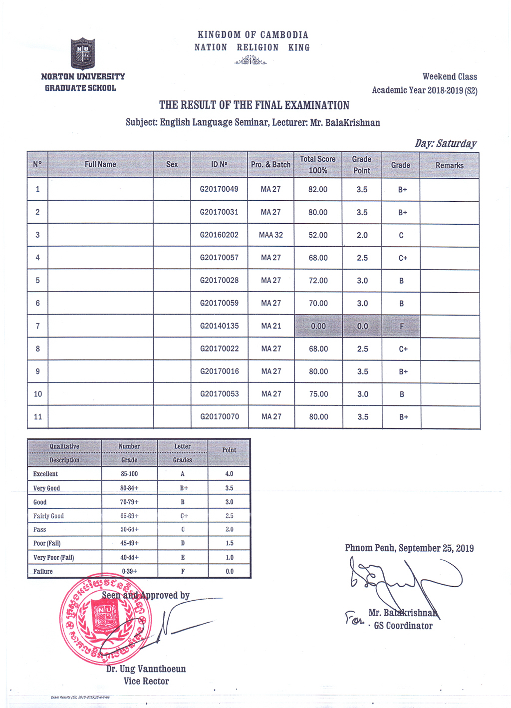 The Result of the Final Examination Semester 2 Academic Year 2018 - 2019 Evening and Weekend Classes