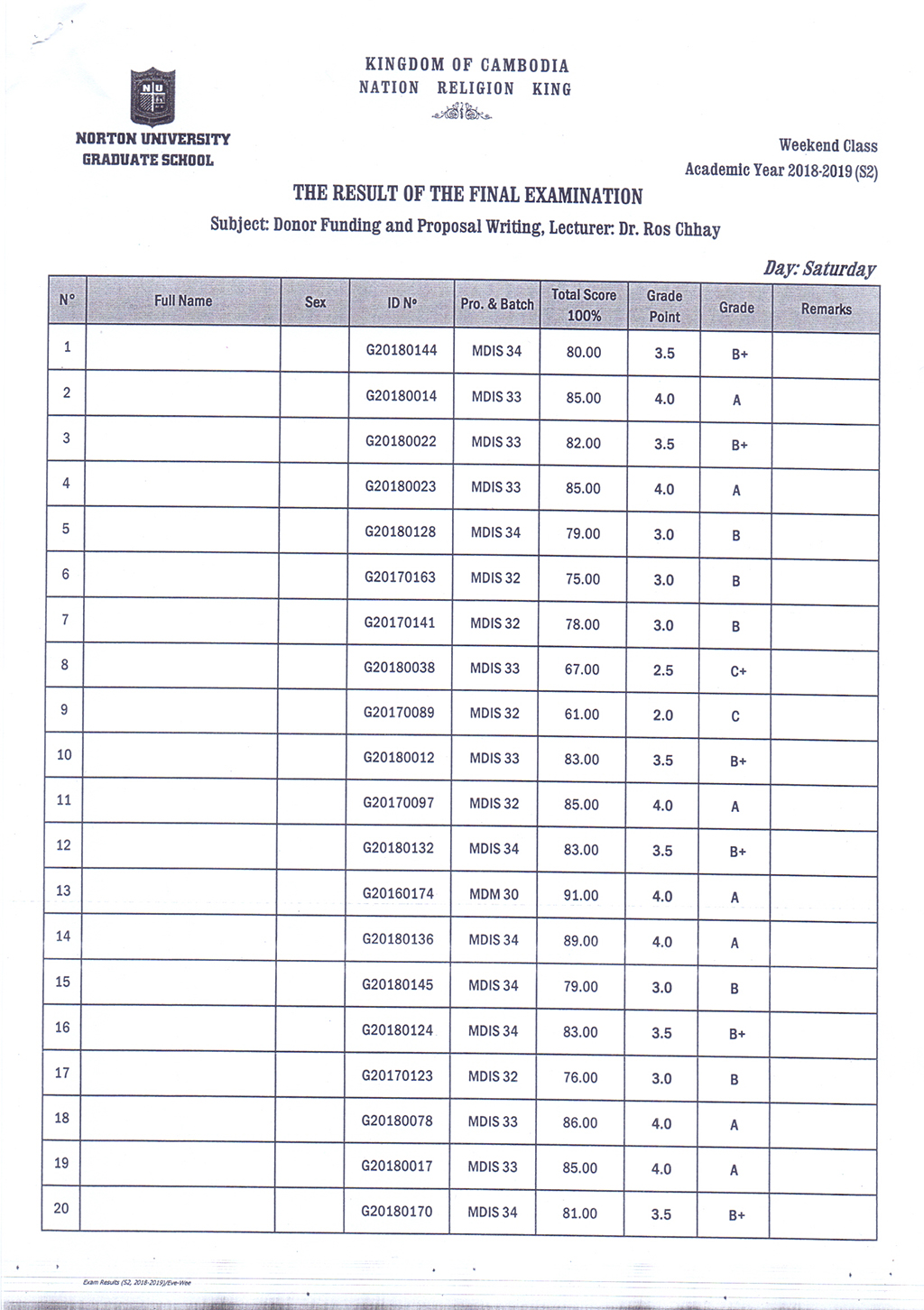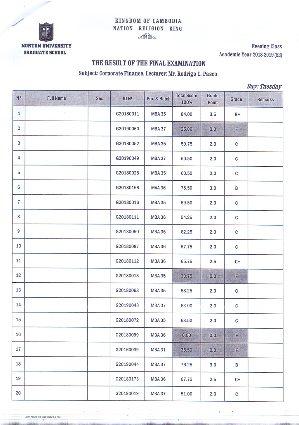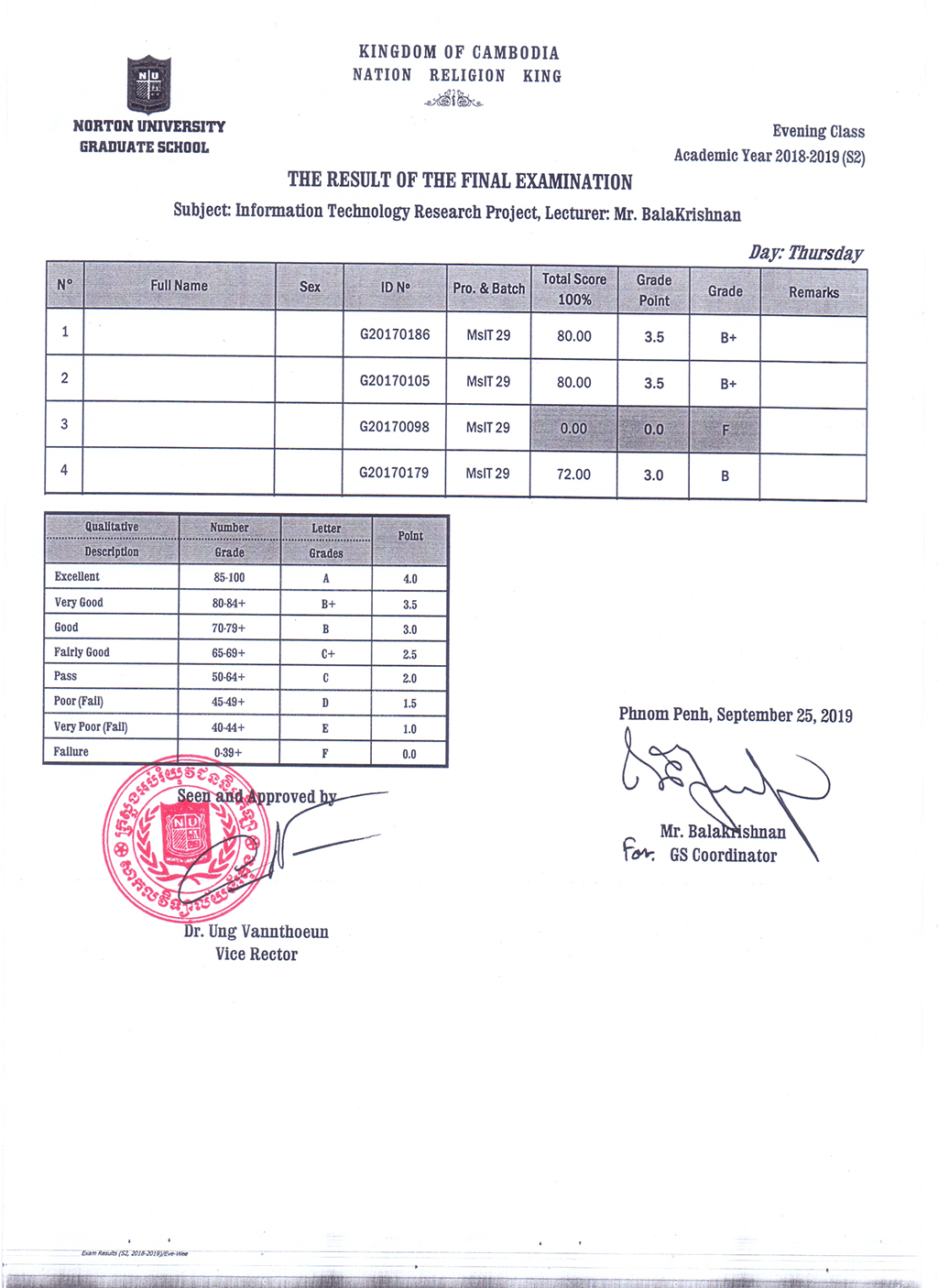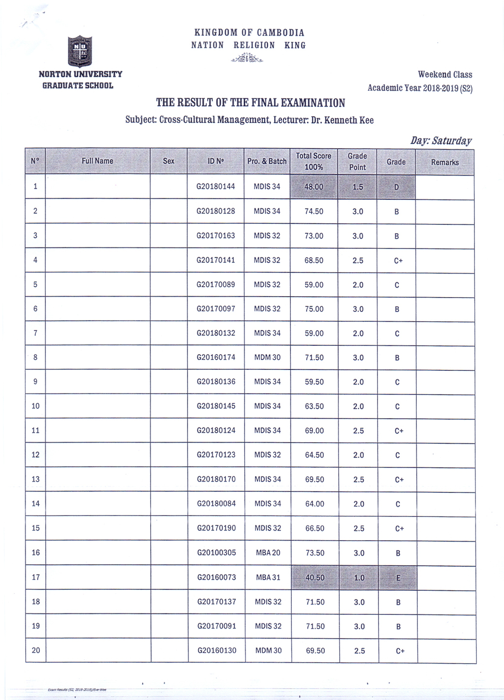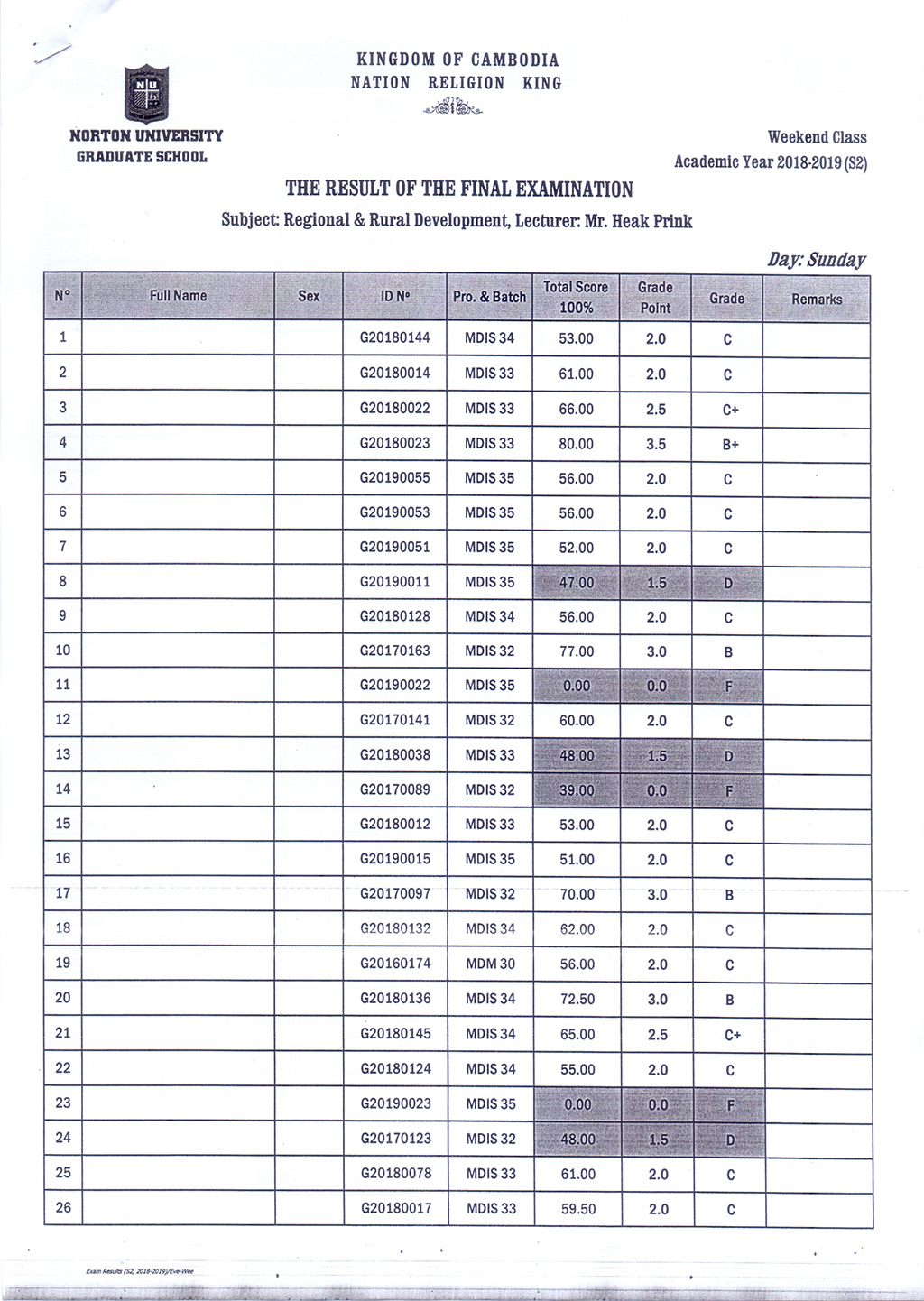 The Result of the Final Examination Semester 2 Academic Year 2018 - 2019 Evening and Weekend Classes