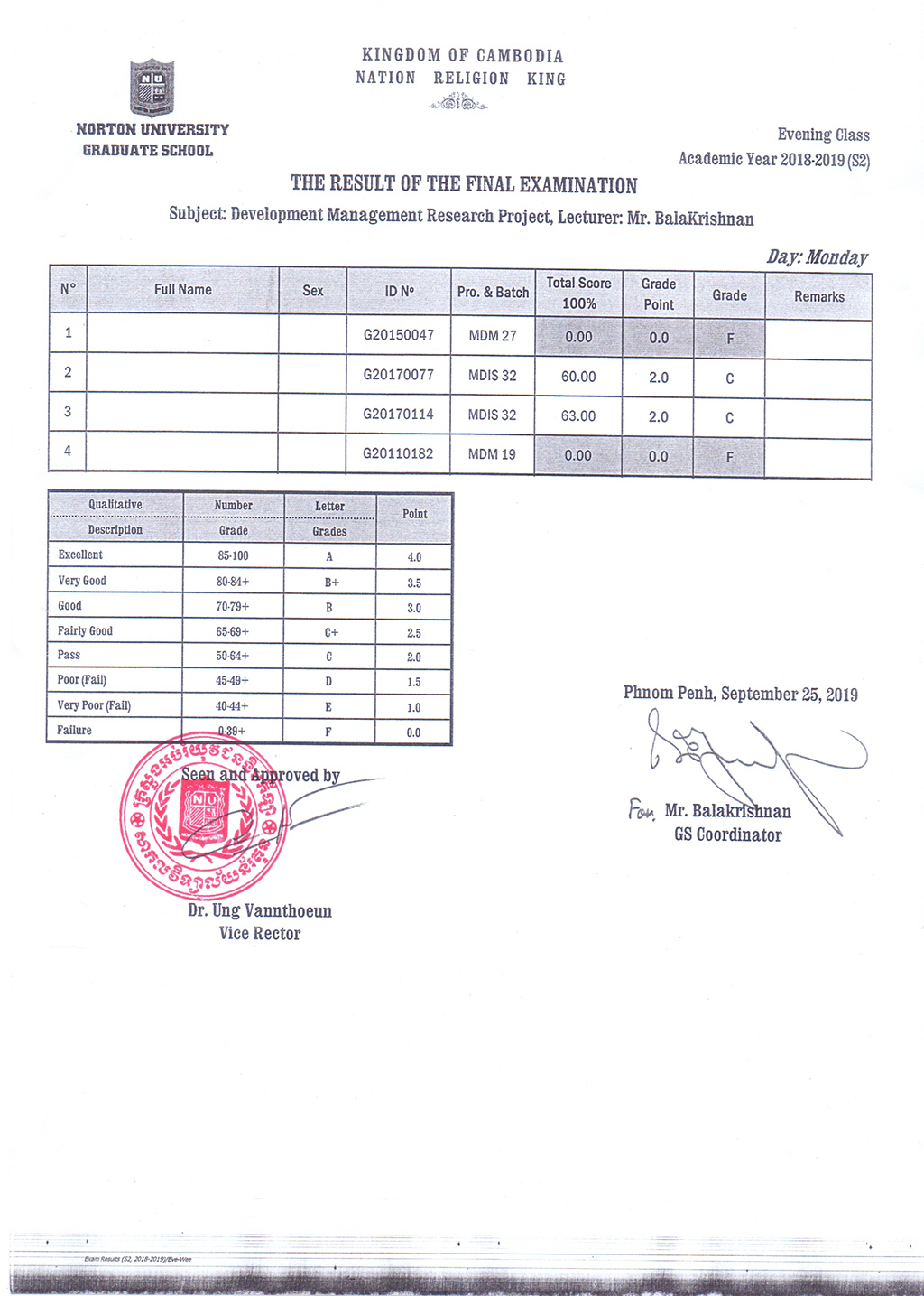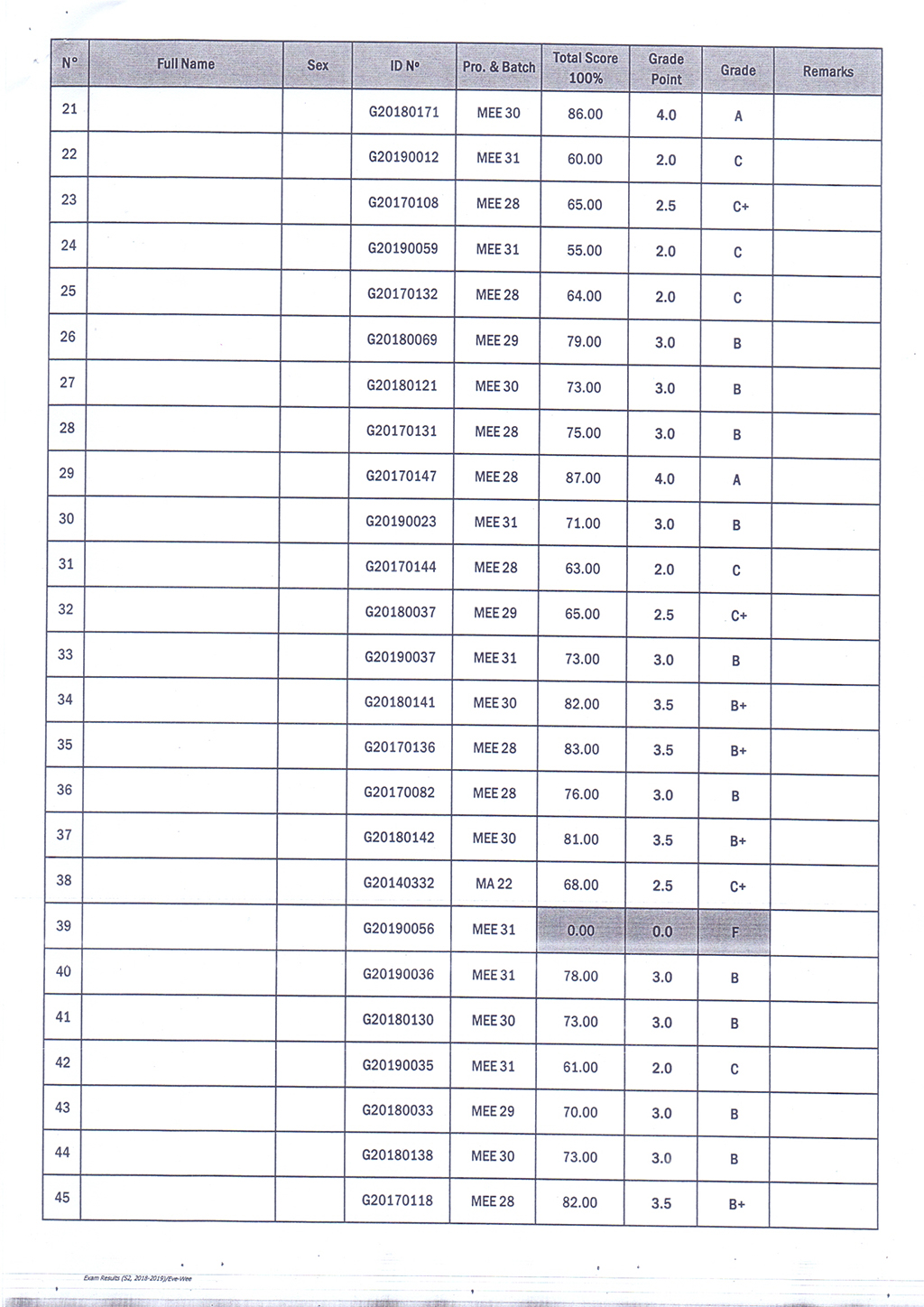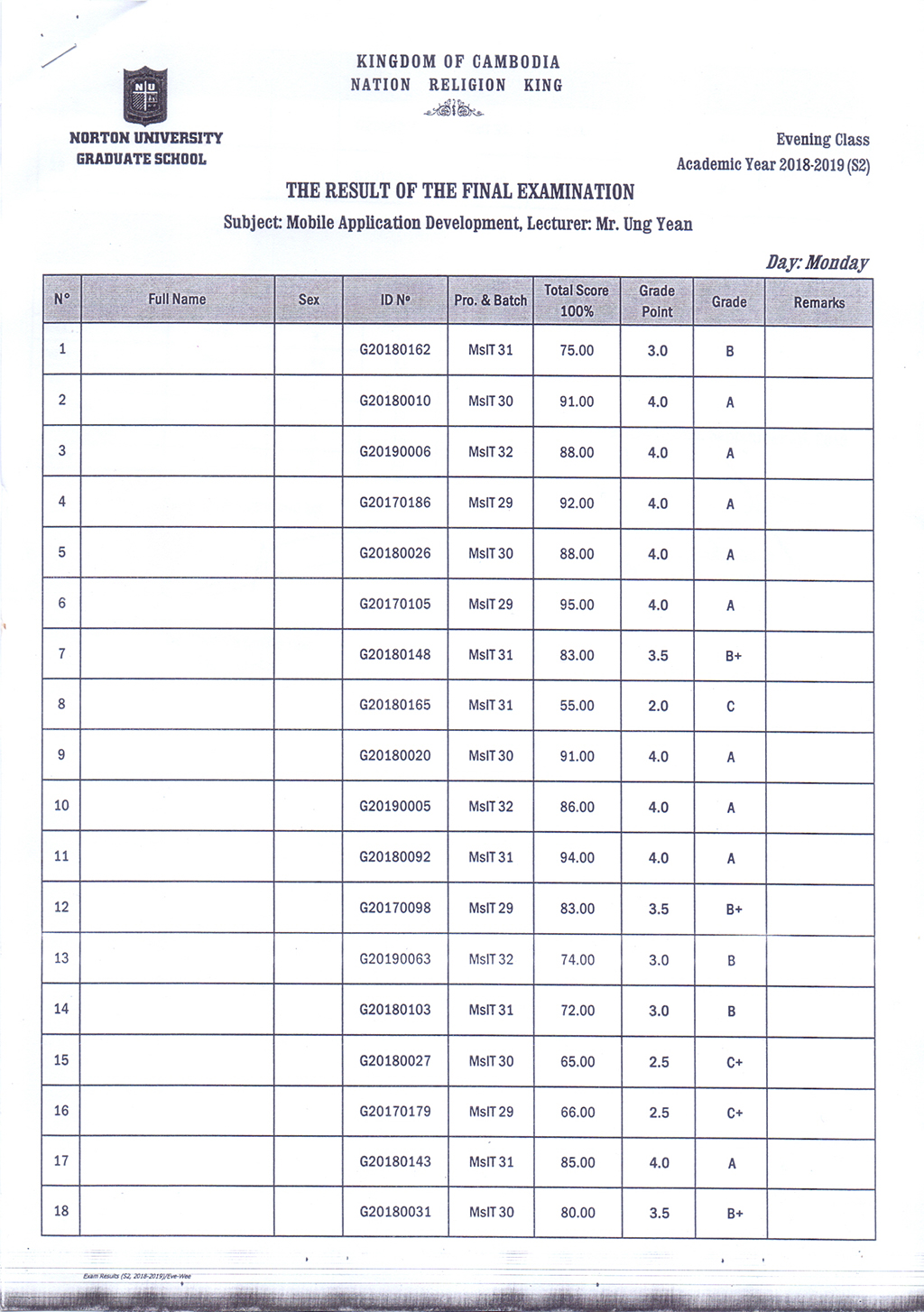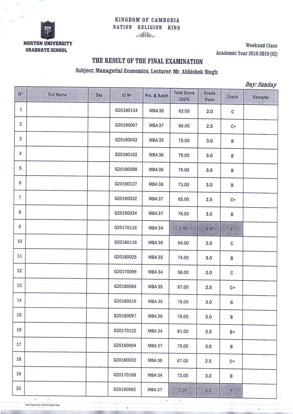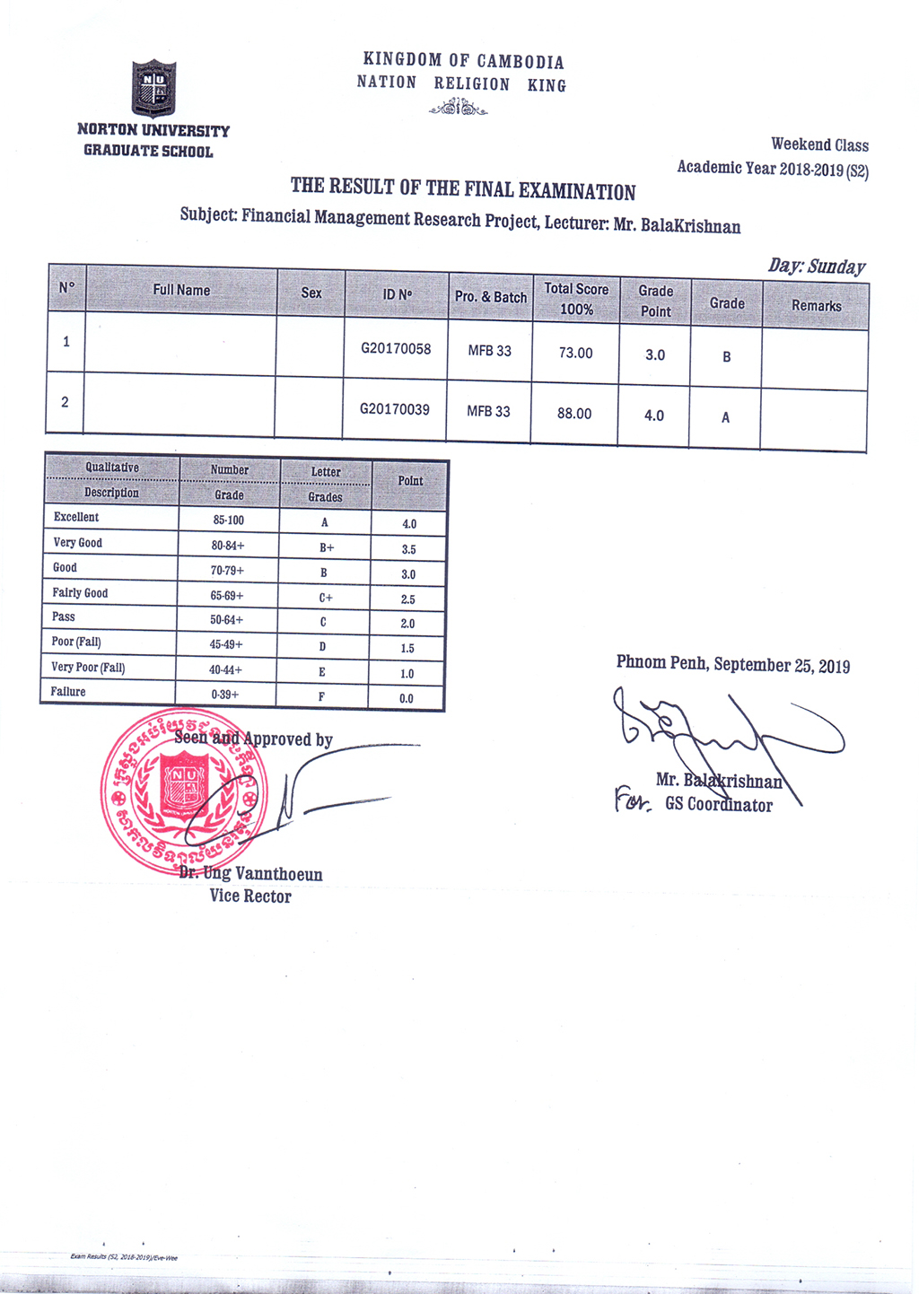 The Result of the Final Examination Semester 2 Academic Year 2018 - 2019 Evening and Weekend Classes