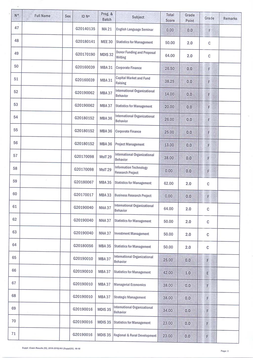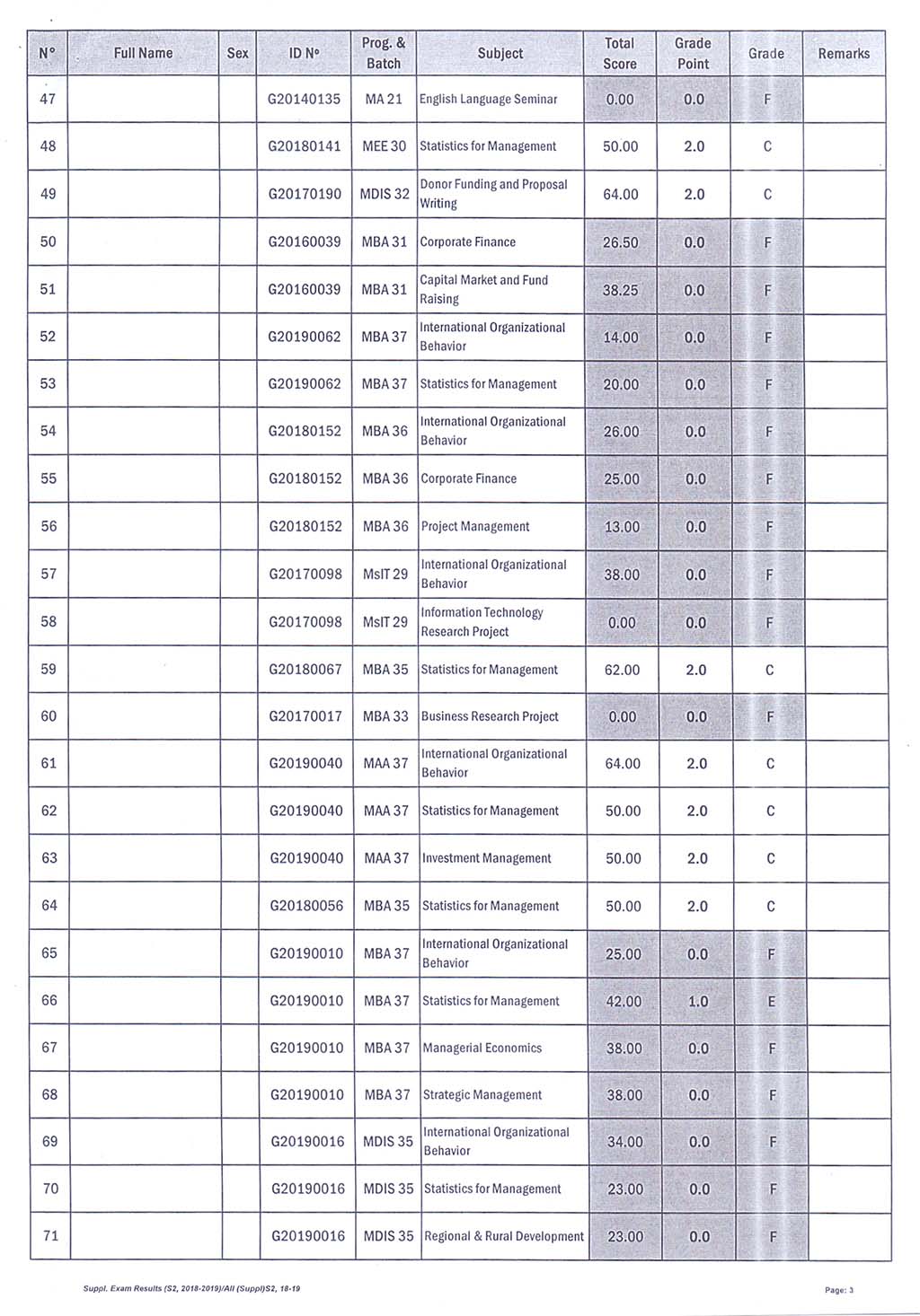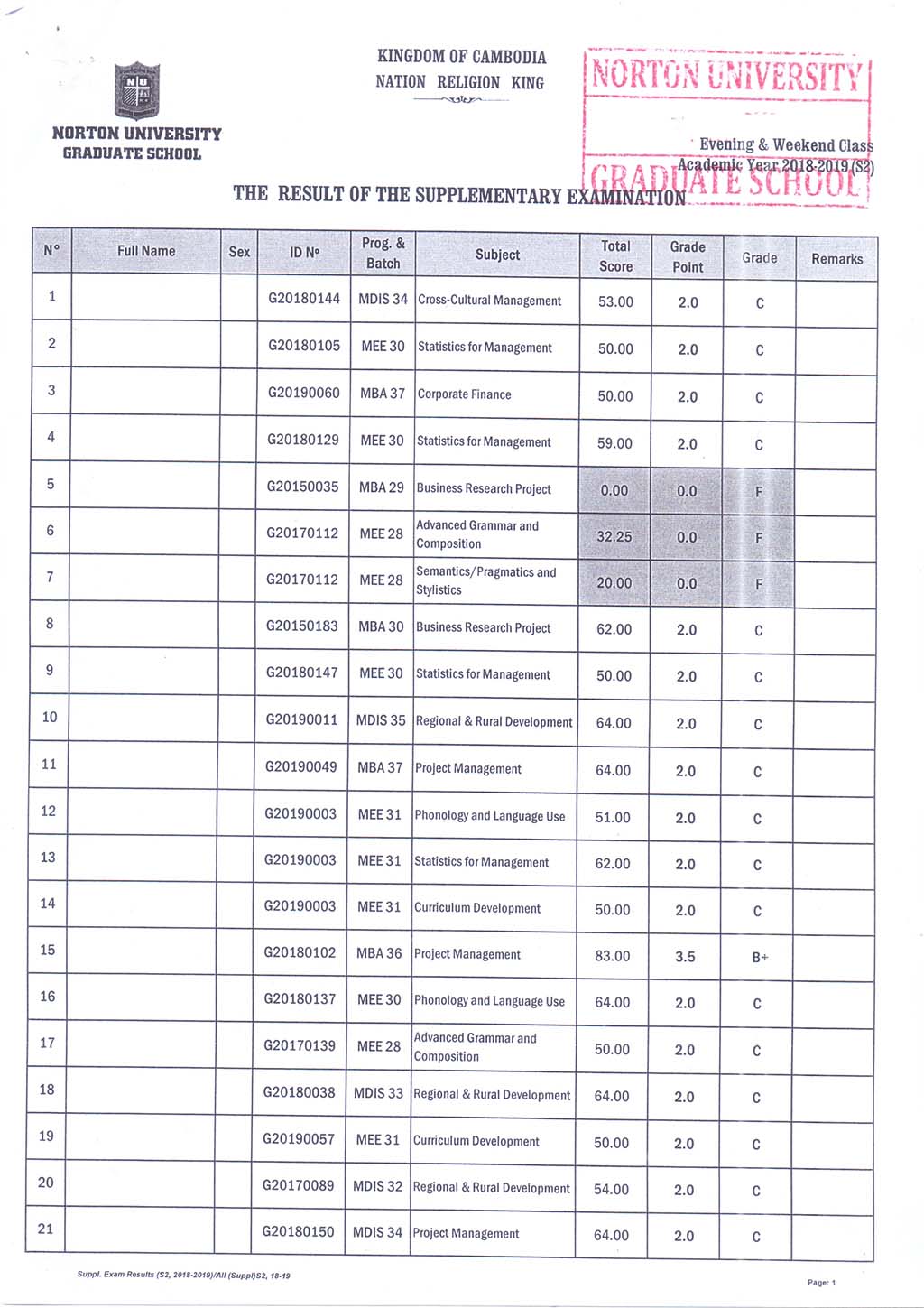 The result of The Supplementary Examination Evening and Weekend Class, Academic Year 2018-2019 Semester 2